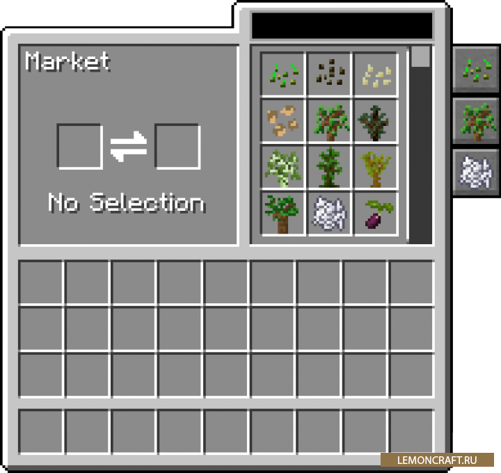 Мод Farming for Blockheads добавит в игру лоток, где вы сможете приобрести саженцы и семена растений. Для покупки семян вам нужно скрафтить сам лоток торговцем в котором будет простой житель. Теперь вы можете обращаться к нему, если вам нужен какой то сорт семян или саженец определенного дерева. В моде присутствует специальный интерфейс, где можно произвести обмен изумрудов на семена или саженцы.